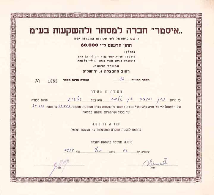 | Vorheriges Los | Zurück | Nächstes Los | | Losnr.: | 74 (Israel) | | Titel: | “ISMAR” Handels- und Investitionsgesellschaft AG | | Auflistung: | 30 shares à 1 IL 16.3.1958. | | Ausruf: | 80,00 EUR | Ausgabe- datum: | 16.03.1958 | Ausgabe- ort: | Jerusalem | | Abbildung: |  | | Stücknr.: | 1885 | | Info: | Gründung 1956 mit einem Kapital von 60.000 IL. Firmensitz in Jerusalem. | | Besonder-heiten: | Aktientext nur hebräisch. | | Verfügbar: | Äußerst selten. | | Erhaltung: | EF-VF. | | Zuschlag: | 80,00 EUR |