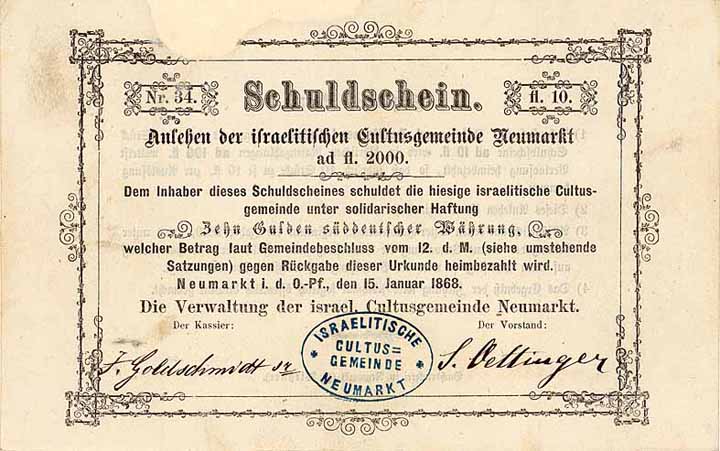 | Vorheriges Los | Zurück | Nächstes Los | | Losnr.: | 77 (Israel) | | Titel: | Israelitische Cultusgemeinde Neumarkt | | Auflistung: | Schuldschein 10 Gulden 15.1.1868 (Auflage 200, R 10). | | Ausruf: | 240,00 EUR | Ausgabe- datum: | 15.01.1868 | Ausgabe- ort: | Neumarkt i.d. O.-Pf. | | Abbildung: |  | | Stücknr.: | 34 | | Info: | Seit Mitte des 13. Jhs. lebten und wirkten Juden in Neumarkt i.d. Oberpfalz. Allerdings kamen sie sehr spät in den Genuss der Bürgerrechte. Die Israeltische Kultusgemeinde in Neumarkt wurde erst 1862 gegründet und zählte 162 Mitglieder (1894). Die in der Stadt tätigen jüdischen Familienunternehmen wurden zum wirtschaftlichen Motor der Region, wie. z.B. die Velocipedwerke der Gebr. Goldschmidt (ab 1897 Expresswerke AG, ab 1899 Fabrikation von Motorfahrzeugen, ab 1914 umfangreiche Kriegslieferungen). Die letzten 15 Juden wurden 1942 aus Neumarkt in die Vernichtungslager abtransportiert. | | Besonder-heiten: | Teil einer unverzinslichen Anleihe von insgesamt 2.000 Gulden, wahrscheinlich ausgegeben zwecks Bau einer Synagoge und Finanzierung des Rabbinats. | | Verfügbar: | Nur 4 Stücke wurden in identischer Qualität in 2004 gefunden. (R 10) | | Erhaltung: | VF+. | | Zuschlag: | 240,00 EUR |