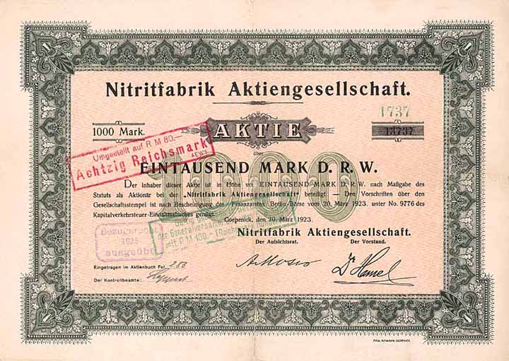 | Vorheriges Los | Zurück | Nächstes Los | | Losnr.: | 1207 (Deutschland bis 1945) | | Titel: | Nitritfabrik AG | | Auflistung: | Aktie 1.000 Mark 20.3.1923 (Auflage 15000, R 11). | | Ausruf: | 75,00 EUR | Ausgabe- datum: | 20.03.1923 | Ausgabe- ort: | Cöpenick | | Abbildung: |  | | Stücknr.: | (13737)1737 | | Info: | Gründung 1906 unter Übernahme einer gleichnamigen GmbH. Die Fabrik an der Wendenschloßstraße zu beiden Seiten eines Stichkanals der Spree beschäftigte auf ihrem Fabrikareal von knapp 60.000 qm etwa 200 Arbeiter. Hergestellt wurden Ameisensäure, Tannin, Gallus- und Pyrogallussäure, Perborat, Wasserstoffsuperoxyd, Borax, Bromsalze und organische Präparate für phamazeutische und photographische Zwecke. 1922 Gründung der “Orgacid” Chemische Fabrik GmbH & Co. zur Herstellung von Oxalsäure und deren Salzen gemeinsam mit dem Auer-Konzern (der seinen Anteil ein Jahr später in Aktien der Nitritfabrik AG tauschte). Großaktionär war die Familie von Gwinner (Arthur von Gwinner war bis zu seinem Tod 1919 Vorstandssprecher der Deutschen Bank). Das Kapital der bis 1926 in Berlin börsennotierten AG mußte zwecks Sanierung 1926 im Verhältnis 5:1 (mit anschließender Wiederaufstockung auf 2 Mio. RM) und 1931 erneut 2:1 auf 1 Mio. RM zusammengelegt werden, 1951 Umstellung 20:1 auf 50.000 DM. 1945 wurde die Köpenicker Fabrik erst vollständig durch die Russen demontiert und dann in Volkseigentum überführt, weshalb die AG ihren Sitz 1949 nach Schleissheim und 1956 weiter nach Feldkirchen bei München verlegte. 1957 Umwandlung in eine GmbH & Co. KG. | | Besonder-heiten: | Mit dekorativer Eichenlaubumrandung. | | Verfügbar: | NICHT lochentwertet. Mit Kupons. (R 11) | | Erhaltung: | VF. | | Zuschlag: | 75,00 EUR |