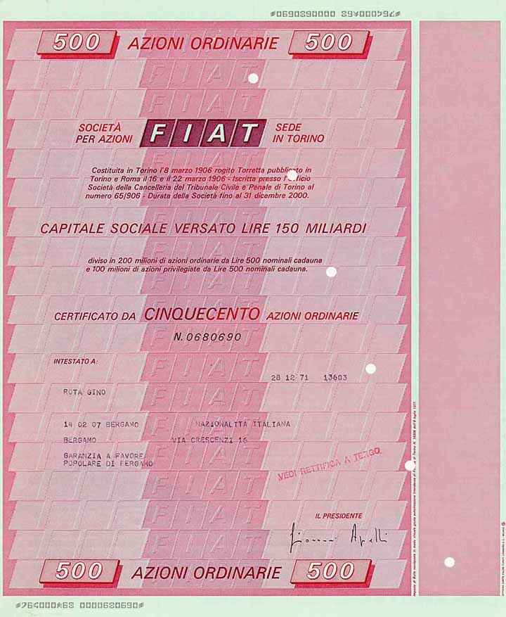 | Vorheriges Los | Zurück | Nächstes Los | | Losnr.: | 47 (Italien) | | Titel: | FIAT S.p.A. | | Auflistung: | 500 Azioni Ordinarie á 500 Lire 28.12.1971. | | Ausruf: | 50,00 EUR | Ausgabe- datum: | 28.12.1971 | Ausgabe- ort: | Turin | | Abbildung: |  | | Stücknr.: | 680690 | | Info: | Giovanni Agnelli, der Graf von Ruffia und der Graf von Bricherasio gründeten 1899 die FIAT-Werke (Fabbrica Italiana Automobili Torino). 1906 wurde das Unternehmen eine AG. Anfang der 1920er Jahre eröffnete eine bedeutende Erweiterung der Produktion den Weg zum Massen-Hersteller. Ende des 20. Jh. lieferte sich FIAT mit VW einen ständigen Kampf um die Spitzenposition auf dem europäischen Markt. Meist gewann VW, doch FIAT kann sich rühmen, mit über 100 Jahren die wesentlich längere Automobil-Tradition zu besitzen. Zum FIAT-Konzern gehörte u.a. auch die Edelmarke Lamborghini sowie Alfa Romeo. Ende der 1990er Jahre beteiligte sich General Motors an der FIAT-Autosparte. Erst war eine langfristige Komplettübernahme geplant, doch 2004 war die finanziell kurzatmige GM froh, sich aus dem Engagement wieder herauskaufen zu können. 2014 Fusion der Fiat S.p.A. mit der US-amerikanischen Chrysler Group LLC zur Fiat Chrysler Automobiles N.V. (FCA). Schließlich ging daraus Anfang 2021 die Holding STELLANTIS hervor, zu der neben FIAT, Alfa Romeo, Chrysler und Jeep inzwischen auch die Marken Peugeot und Citroen sowie neuerdings die von GM abgegebene deutsche Opel gehören. | | Besonder-heiten: | Faksimileunterschrift Giovanni Agnelli als Presidente. | | Verfügbar: | Lochentwertet. Restkuponbogen anhängend. Bei uns noch nie zuvor angeboten gewesen. | | Erhaltung: | EF. | | Zuschlag: | 50,00 EUR |