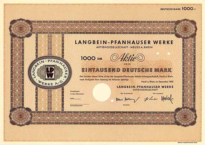 | Vorheriges Los | Zurück | Nächstes Los | | Losnr.: | 892 (Deutschland ab 1948 (Die Deutsche Mark)) | | Titel: | Langbein-Pfanhauser Werke AG | | Auflistung: | Aktie 1.000 DM Dez. 1962 (Muster, R 10). | | Ausruf: | 150,00 EUR | Ausgabe- datum: | 01.12.1962 | Ausgabe- ort: | Neuss | | Abbildung: |  | | Info: | Gründung 1907 durch Fusion der Dr. G. Langbein & Co. in Leipzig (gegr. 1881) mit Filialen in Berlin, Solingen, Wien, Mailand und Brüssel mit der Firma Wilh. Pfanhauser in Wien (gegr. 1873). Fabriken für Galvanotechnik und Elektrochemie sowie Dynamo- und Maschinenbau in Leipzig und Oerlikon/Schweiz. Seinerzeit in Leipzig börsennotiert. 1948 in der DDR enteignet, daraufhin Sitzverlegungen nach Düsseldorf (1951), Neuss (1953) und zurück nach Düsseldorf (1999). 2001 aufnehmende Gesellschaft bei der Fusion mit der Vereinigte Deutsche Nickel AG, der Hindrichs-Auffermann AG und der DOAG AG, zugleich Umfirmierung in VDN Vereinigte Deutsche Nickel-Werke AG. 2005 Eröffnung des Insolvenzverfahrens. | | Verfügbar: | R 10 | | Erhaltung: | UNC-EF. | | Zuschlag: | 150,00 EUR |