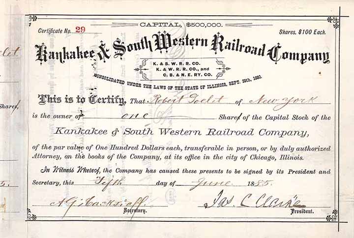 | Vorheriges Los | Zurück | Nächstes Los | | Losnr.: | 52 (U.S.A.) | | Titel: | Kankakee & South Western Railroad Co. | | Auflistung: | 1 share à 100 $ 5.6.1885. | | Ausruf: | 60,00 EUR | Ausgabe- datum: | 05.06.1885 | Ausgabe- ort: | Chicago, Illinois | | Abbildung: |  | | Stücknr.: | 29 | | Info: | Gründung am 28.9.1880. Hauptstrecke: Otto, Ill. - Bloomington, Ill., 79,46 Meilen lang. Nebenstrecken: Buckingham - Tracy, 10 Meilen; Kempton - Minonk, 41,8 Meilen. Teil des Vanderbilt’schen Eisenbahnsystems, kontrolliert durch die Illinois Central RR Co. | | Verfügbar: | Einzelstück beim Einlieferer. | | Erhaltung: | VF. | | Zuschlag: | offen |