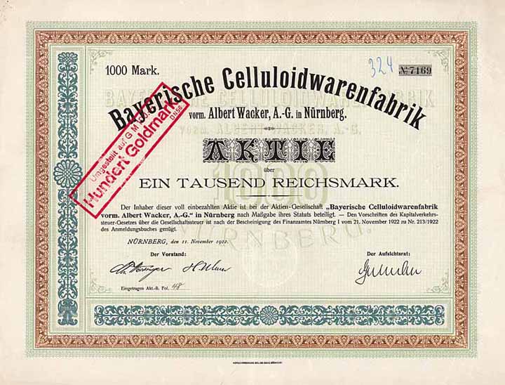 | Vorheriges Los | Zurück | Nächstes Los | | Losnr.: | 1147 (Deutschland 1919-1923 (Die Inflation)) | | Titel: | Bayerische Celluloidwarenfabrik vorm. Albert Wacker AG | | Auflistung: | Aktie 1.000 Mark 11.11.1922. | | Ausruf: | 60,00 EUR | Ausgabe- datum: | 11.11.1922 | Ausgabe- ort: | Nürnberg | | Abbildung: |  | | Stücknr.: | 7775 | | Info: | Gründung 1897. In der Fabrik in der Landgrabenstraße wurden hauptsächlich Toilettengegenstände, Spiegel, Dosen, Bürsten, Puppen, Spielsachen und Reklame-Artikel hergestellt. Börsennotiz München, Berlin und Frankfurt. | | Erhaltung: | Mit Kupons. VF. | | Zuschlag: | 60,00 EUR |
