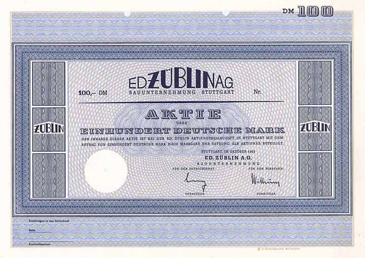 | Vorheriges Los | Zurück | Nächstes Los | | Losnr.: | 1648 (Deutschland 1948-2000 (Die Deutsche Mark)) | | Titel: | Ed. Züblin AG Bauunternehmung | | Auflistung: | Aktie 100 DM Okt. 1962 (Muster). | | Ausruf: | 100,00 EUR | Ausgabe- datum: | 01.10.1962 | Ausgabe- ort: | Stuttgart | | Abbildung: |  | | Info: | 1898 gründet der Schweizer Ingenieur Eduard Züblin in Straßburg sein “Ingenieur-Bureau für Cement-Eisenconstructionen”. Bereits in den ersten Jahren entwickelt sich das Unternehmen stürmisch und erfolgreich. 1899 wird der erste Auslandsauftrag durchgeführt: eine Tuchmanufaktur in der Nähe von Riga. 1916 stirbt Eduard Züblin, zwei Jahre vor der Vollendung seiner schönsten Arbeit, der Rettung des einsturzgefährdeten Turms des Straßburger Münsters. Die Unterfangung eines Turmpfeilers mit dauerhafter Sanierung des morschen Pfeilerfundaments ist riskant - aber sie gelingt. Zu Beginn des Ersten Weltkrieges existieren Niederlassungen in Basel, Brüssel, Duisburg, Kehl, Mailand, Paris, Riga, Stuttgart, Wien und Zürich. Die Ed. Züblin AG mit Sitz in Stuttgart führt seit 1919 die Aktivitäten des Stammhauses in Deutschland. Herausragende Projekte sind die Errichtung des Hamburger Hauptbahnhofs auf 800 Eisenbetonpfählen (1902), Errichtung zahlreicher Brücken im Rahmen verschiedener Autobahnprojekte (ab 1933), Mitwirkung am Bau des Volkswagenwerkes, Bau des ersten Tunnels der Bahnstrecke Hannover-Würzburg (1981), Verschiebung des denkmalgeschützten Kaisersaals am Potsdamer Platz um 75 m (1996). Nach Insolvenz des Großaktionärs Walter Bau AG in 2005 gehört die Gesellschaft heute mehrheitlich zur österreichischen Bauholding STRABAG AG. | | Verfügbar: | Bislang unbekannt, nicht katalogisiert. | | Erhaltung: | Abheftlochung. UNC-EF. | | Zuschlag: | 100,00 EUR |