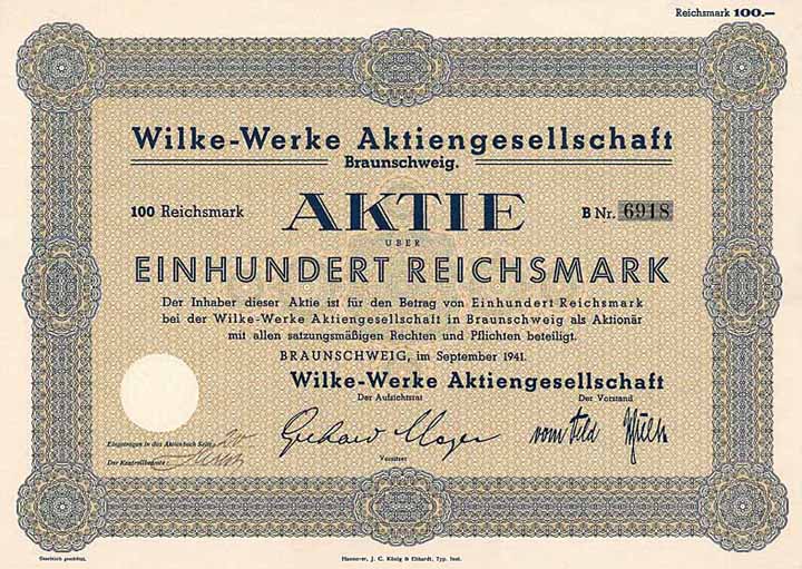 | Vorheriges Los | Zurück | Nächstes Los | | Losnr.: | 1344 (Deutschland 1924-1945 (III. Reich)) | | Titel: | Wilke-Werke AG | | Auflistung: | Aktie 100 RM Sept. 1941 (Auflage 2000). | | Ausruf: | 70,00 EUR | Ausgabe- datum: | 01.09.1941 | Ausgabe- ort: | Braunschweig | | Abbildung: |  | | Stücknr.: | 6905 | | Info: | 1856 gründete Schlossermeister August Wilke eine Schlosserei, die sich rasch zu einer ansehnlichen Fabrik entwickelte. AG seit 1881 als "Dampfkessel- und Gasometerfabrik vorm. A. Wilke & Comp." Neben Stahlbau, Kesselbau und Gasbehälterbau nach der Wende zum 20. Jh. vor allem Bau von Tankanlagen, Mineralölverarbeitungsanlagen und "Kito"-Sicherungen für feuergefährliche Flüssigkeiten (letzteres die einzige Sparte, die nach dem Konkurs 1978 in einer Auffanggesellschaft gerettet werden konnte). Erst 2003 wurden die inzwischen ganz verfallenen Gebäude auf dem riesigen Fabrikareal an der Frankfurter Straße abgerissen. Früher in Hannover börsennotiert. | | Erhaltung: | Mit Kupons. EF+. | | Zuschlag: | 70,00 EUR |