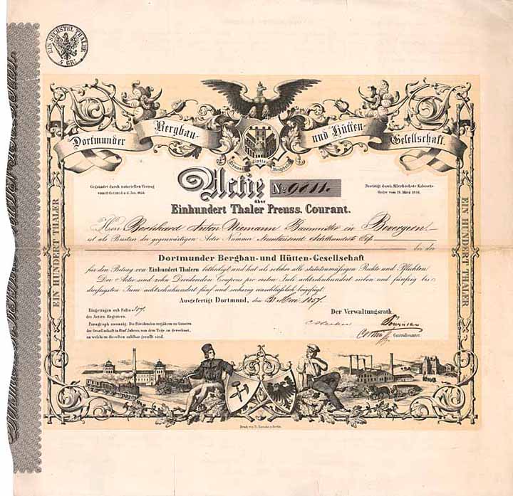 | Vorheriges Los | Zurück | Nächstes Los | | Losnr.: | 725 (Deutschland bis 1869 (Industrielle Revolution)) | | Titel: | Dortmunder Bergbau- und Hütten-Gesellschaft | | Auflistung: | Actie 100 Thaler 23.5.1857. Gründeraktie. | | Ausruf: | 1.500,00 EUR | Ausgabe- datum: | 23.05.1857 | Ausgabe- ort: | Dortmund | | Abbildung: |  | | Stücknr.: | 9811 | | Info: | Die Recherche zu dieser Gesellschaft ergab eine kleine Sensation, die wegen der höchst wechselvollen Entwicklung bisher verborgen geblieben war: Es ist eine der Keimzellen von HOESCH! Nicht weniger als acht Besitzer im Laufe der Zeit hatte das Werk, eines der traditionsreichsten im Ruhrgebiet. Nachdem die AG drei Jahren nach ihrer Gründung bereits 1859 wieder in Konkurs gegangen war, sind die erwähnenswertesten Nachbesitzer: 1869 der berühmt-berüchtigte Bethel Henry STROUSBERG, geboren 1823 in Ostpreußen als Barthel Heinrich Straußberg, nach seiner Rückkehr aus England 1863 bis zum Gründerkrach der unbestrittene Eisenbahnkönig in Deutschland; 1872 die Union AG für Bergbau, Eisen- und Stahlindustrie; 1910 der Deutsch-Luxemburgische Bergwerks- und Hüttenverein; 1926 die Vereinigte Stahlwerke AG; 1951 die Dortmund-Hoerder Hüttenunion AG; 1970 die Hoesch AG. | | Besonder-heiten: | Äußerst dekorative Gestaltung. Originalunterschriften. | | Verfügbar: | Von der 1857er Emission sind seit Ewigkeiten weniger als 10 Stück bekannt. | | Erhaltung: | VF. | | Zuschlag: | offen |