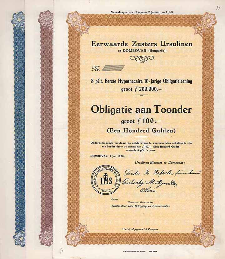 | Vorheriges Los | Zurück | Nächstes Los | | Losnr.: | 703 (k.u.k Monarchie / Nachfolgestaaten) | | Titel: | Eerwarde Zusters Ursulinen (Ehrwürdige Schwestern Ursulinen) - 3 Stücke | | Auflistung: | 8 % Obl. 100 fl., 500 fl. und 1.000 fl. 1.7.1928 (Blanketten). | | Ausruf: | 100,00 EUR | Ausgabe- datum: | 01.07.1928 | Ausgabe- ort: | Dombovar | | Abbildung: |  | | Info: | Der nach Augustinerregeln lebende Orden benannte sich nach der hl. Ursula und ist vorwiegend in Europa und Nordamerika verbreitet. Er widmet sich vorrangig der Erziehung und dem Unterricht der weibl. Jugend. | | Besonder-heiten: | Teil einer Anleihe von insgesamt 200.000 fl., auferlegt in der Niederlande zwecks Finanzierung eines Heimes an einer neugebauten von den Ursulinen geleiteten Schule in der ungarischen Stadt Dombovar. Es wurden nur 150 Obl. mit dem Nennwert 1.000 fl. ausgegeben. Anleihentext nur niederländisch, rückseitig Anleihenbedingungen, u.a. Beschreibung der hypothekarischen Sicherheiten. Mit anh. kpl. Kuponbögen und einem Emissionsprospekt und Zeichnungsschein in niederländischer Sprache. | | Verfügbar: | Äußerst selten. | | Erhaltung: | EF. | | Lot: | Ja | | Zuschlag: | offen |