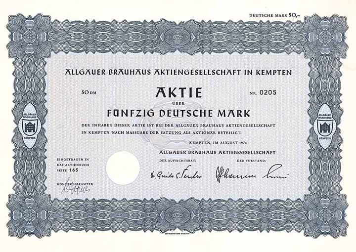 | Vorheriges Los | Zurück | Nächstes Los | | Losnr.: | 1019 (Brauerein) | | Titel: | Allgäuer Brauhaus AG | | Auflistung: | Aktie 50 DM Aug. 1974 (gültige Aktie). | | Ausruf: | 450,00 EUR | Ausgabe- datum: | 01.08.1974 | Ausgabe- ort: | Kempten | | Abbildung: |  | | Stücknr.: | 3 | | Info: | Gründung 1911 durch Übernahme des Bürgerlichen Brauhauses Kempten A. Weixler, gleichzeitig Gründung der Gasthausgesellschaft Gambrinus GmbH in Kempten. Produktion von untergärigen Lager- und Exportbieren (Spezialität: Allgäuer Edelbräu), ferner Eis, Malz, Futtermittel und Limonaden. 1967 erwarb die Frankfurter Binding-Brauerei eine Beteiligung (1972 erst einmal wieder an die Vereinsbank verkauft), heute ist die Binding-Tochter Mainzer Aktien-Bierbrauerei Mehrheitsaktionär. | | Erhaltung: | Unentwertet, mit Kupons. Niedrige Nummer! UNC. | | Zuschlag: | offen |