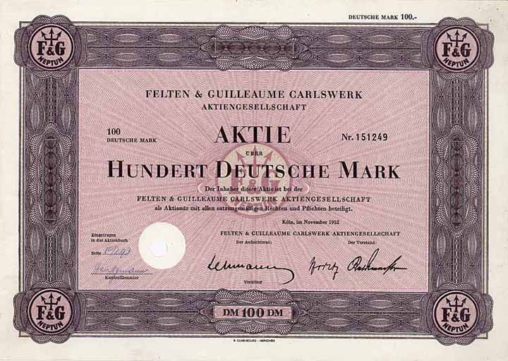 | Vorheriges Los | Zurück | Nächstes Los | | Losnr.: | 1435 (Deutschland 1948-2000 (Die Deutsche Mark)) | | Titel: | Felten & Guilleaume Carlswerk AG | | Auflistung: | Aktie 100 DM Nov. 1952. | | Ausruf: | 50,00 EUR | Ausgabe- datum: | 01.11.1952 | Ausgabe- ort: | Köln | | Abbildung: |  | | Stücknr.: | 152668 | | Info: | Ursprüngliche Gründung 1826 in Köln als Hanfseilerei. 1873 wurde für die Herstellung von Draht, Drahtseilen und Kabeln in Mülheim am Rhein eine Niederlassung errichtet. Dieses Zweigwerk wurde 1899 in einer AG verselbständigt. 1905 Angliederung der Frankfurter Maschinenfabrik der "Elektrizitäts-AG vorm. W. Lahmeyer & Co." Bereits 1910 wurde dieses Werk wieder abgestoßen und die alte Firmenbezeichnung wieder angenommen. Großaktionär war lange Zeit der Luxemburger Arbed-Konzern. 1979 erwarb der Philips-Konzern die Mehrheit und firmierte das Unternehmen in PKI Philips Kommunikations Industrie AG um. Unter dem alten Namen wurde für das ursprüngliche Geschäft die Felten & Guilleaume Energietechnik AG 1986 aus der PKI herausgelöst und an die Börse gebracht. | | Besonder-heiten: | Schöner Druck mit Firmenlogo in allen vier Ecken. | | Erhaltung: | Lochentwertet. EF. | | Zuschlag: | offen |