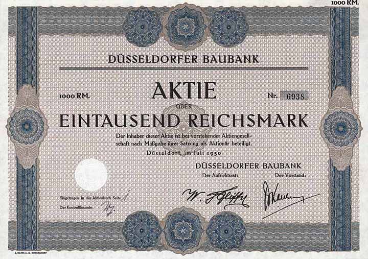 | Vorheriges Los | Zurück | Nächstes Los | | Losnr.: | 1260 (Deutschland 1924-1945 (III. Reich)) | | Titel: | Düsseldorfer Baubank | | Auflistung: | Aktie 1.000 RM Juli 1930. | | Ausruf: | 75,00 EUR | Ausgabe- datum: | 01.07.1930 | Ausgabe- ort: | Düsseldorf | | Abbildung: |  | | Stücknr.: | 6938 | | Info: | Gründung 1872 als Terraingesellschaft. Außer dem "Palast Hotel Breidenbacher Hof" gehörten zum Besitztum noch 4500 qm Bauterrains in Düsseldorf. Börsennotiz Düsseldorf. Stark betroffen durch das Vergleichsverfahren der Disch-Hotel und Verkehrs-AG, Frankfurt a.M. sowie durch den Nachlasskonkurs des verstorbenen Großaktionärs Sternberg. Die Gesellschaft wurde 1938 aufgelöst. | | Erhaltung: | Ef. | | Zuschlag: | offen |