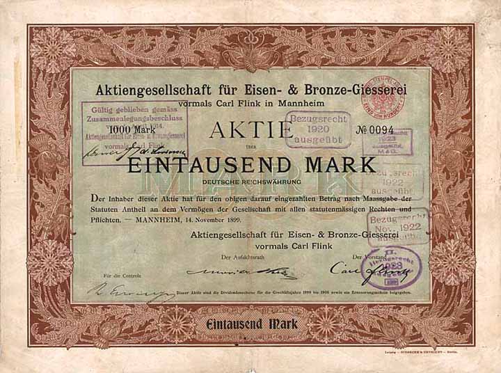 | Vorheriges Los | Zurück | Nächstes Los | | Losnr.: | 807 (Deutschland 1875-1918 (Die Kaiserzeit)) | | Titel: | AG für Eisen- & Bronze-Giesserei vormals Carl Flink | | Auflistung: | Aktie 1.000 Mark 14.11.1899. Gründeraktie (Auflage 1000, nach Kapitalherabsetzung 1914 noch 875). | | Ausruf: | 800,00 EUR | Ausgabe- datum: | 14.11.1899 | Ausgabe- ort: | Mannheim | | Abbildung: |  | | Stücknr.: | 94 | | Info: | Gegründet 1899 unter Übernahme der Eisen- und Bronze-Giesserei von Carl Fink in Mannheim. Fertigungsschwerpunkte waren Fassaden-Elemente, Balkone, Veranden, Wintergärten, feuersichere Treppenanlagen sowie Grab- und Baudekorationen in echter Bronze. Die Umstellung auf Heereslieferungen im 1. Weltkrieg und die anschließende Wiederaufnahme der Friedensproduktion machte der Firma den Garaus: 1925 in Liquidation getreten, 1927 erloschen. | | Besonder-heiten: | G&D-Druck mit herrlicher Umrahmung im Sütterlin-Stil. | | Verfügbar: | Noch nie zuvor angeboten gewesen, Einzelstück aus einer uralten sammlung. | | Erhaltung: | Mit Kupons. VF-. | | Zuschlag: | offen |