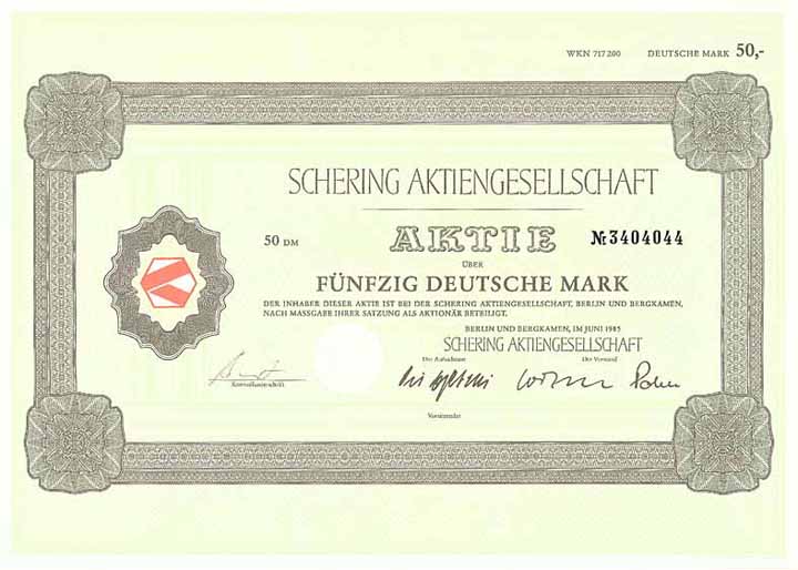 | Vorheriges Los | Zurück | Nächstes Los | | Losnr.: | 1780 (Deutschland 1948-2000 (Die Deutsche Mark)) | | Titel: | Schering AG | | Auflistung: | Aktie 50 DM Juni 1985. | | Ausruf: | 40,00 EUR | Ausgabe- datum: | 01.06.1985 | Ausgabe- ort: | Berlin und Bergkamen | | Abbildung: |  | | Stücknr.: | 3410042 | | Info: | Hervorgegangen aus der 1851 von Ernst Schering eröffneten “Grünen Apotheke” in der Chausseestraße in Berlin. 1864 gliederte Schering eine Fabrik für reine Jod- und Bromverbindungen an. 1871 Umwandlung in die “Chemische Fabrik auf Actien (vorm. E. Schering)”. In den 20er Jahren expandierte Schering besonders in den Bereich Photopapiere und Photochemikalien und übernahm 1927 in diesem Zusammenhang mit der Voigtländer & Sohn AG in Braunschweig die älteste deutsche Kamerafabrik. Ebenfalls 1927 Fusion mit der C.A.F. Kahlbaum Chem. Fabrik GmbH in Berlin zur Schering-Kahlbaum AG. 1937 Fusion mit der (Oberschlesische) Kokswerke & Chemische Fabriken AG (gegr. 1890), die fast 100 % der Schering-Aktien hielt, zur “neuen” Schering AG. 1967 Errichtung eines zweiten Sitzes in Bergkamen (Westf.). Bis heute einer der 30 DAX-Werte und einer der bedeutendsten Hersteller von pharmazeutischen Spezialitäten und Substanzen (am bekanntesten wurde “Die Pille”), Pflanzenschutz- und Schädlingsbekämpfungsmitteln, Industriechemikalien uvm. Werke in Berlin-Wedding, Bergkamen und Wolfenbüttel. | | Erhaltung: | Entwertet. UNC-EF. | | Zuschlag: | 40,00 EUR |