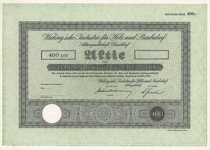 | Vorheriges Los | Zurück | Nächstes Los | | Losnr.: | 1833 (Deutschland 1948-2000 (Die Deutsche Mark)) | | Titel: | Wicking'sche Industrie für Holz und Baubedarf AG | | Auflistung: | Aktie 400 DM März 1953 (Auflage 2700). | | Ausruf: | 50,00 EUR | Ausgabe- datum: | 01.03.1953 | Ausgabe- ort: | Düsseldorf | | Abbildung: |  | | Stücknr.: | 1169 | | Info: | Gründung 1907 in Recklinghausen durch Zusammenschluß der “Westfälische Kalkindustrie A. Wicking & Co.” und der “Wicking’sche Hobel- und Sägewerke GmbH”. 1924 Sitzverlegung nach Düsseldorf. Der Holz- und Baustoffgroßhandel hatte nach dem Krieg Filialen in Düsseldorf-Oberbilk, Hagen (Westf.), Ratingen, Recklinghausen und Siegburg, später auch in Dudweiler/Saar (1971) und Bochum (1973). 1982 nach 15 dividendenlosen Jahren Aufgabe des Holz- und Baustoffhandels, 1984 Umfirmierung in “Wicking’sche Industrie für Beteiligungen AG” , nachdem die VA Vermögensverwaltungs-AG in Hamburg Mehrheitsaktionätr geworden war. 1988 auf die WESTEND Terrain und Beteiligungsholding AG in Frankfurt/Main verschmolzen. | | Erhaltung: | UNC. | | Zuschlag: | offen |