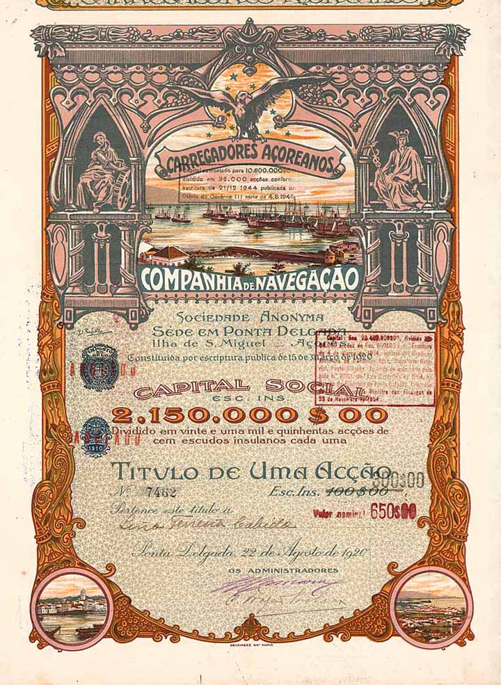 | Vorheriges Los | Zurück | Nächstes Los | | Losnr.: | 598 (Portugal) | | Titel: | Carregadores Acoreanos Cie. de Navegacao S.A. | | Auflistung: | Accao 100$00 Esc. 22.8.1920. Gründeraktie. | | Ausruf: | 50,00 EUR | Ausgabe- datum: | 22.08.1920 | Ausgabe- ort: | Ponte Delgada | | Abbildung: |  | | Stücknr.: | 17348 | | Besonder-heiten: | Hochdekorativer, großformatiger Maritimtitel von den Azoren mit drei Vignetten: idyllische Hafenszene und Hafenstädte. | | Erhaltung: | EF-VF. | | Zuschlag: | 50,00 EUR |
