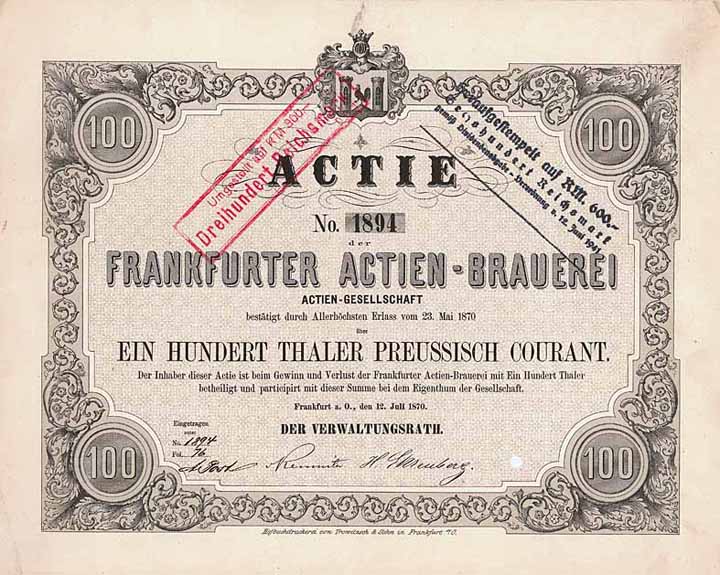 | Vorheriges Los | Zurück | Nächstes Los | | Losnr.: | 1013 (Deutschland 1870-1874 (Die Gründerzeit)) | | Titel: | Frankfurter Actien-Brauerei AG | | Auflistung: | Aktie 100 Thaler 12.7.1870. Gründeraktie (Auflage 2000). | | Ausruf: | 100,00 EUR | Ausgabe- datum: | 12.07.1870 | Ausgabe- ort: | Frankfurt a.O. | | Abbildung: |  | | Stücknr.: | 1894 | | Info: | Gründung 1870 unter der Firma Frankfurter Actien-Brauerei AG. Brauerei in der Fürstenwalder Str. 69. Dazu 1918 noch Erwerb der Bergbrauereien Herm. Dahlenburg, Ad. Ehrenberg und A. Dietl in Landsberg a.W. , der Feldschlösschen-Brauerei in Sommerfeld N.L. und der Brauerei Paul Genieser in Küstrin. 1935 Umfirmierung in Ostquell-Brauerei AG, unter diesem Namen nach der Wende wiederauferstanden, 1991 übernommen durch die Berliner Schultheiss Brauerei AG. | | Besonder-heiten: | Besonders reich verzierte Umrahmung mit Frankfurter Stadtwappen. Lochentwertet (RB). | | Erhaltung: | EF-VF. | | Zuschlag: | 110,00 EUR |
