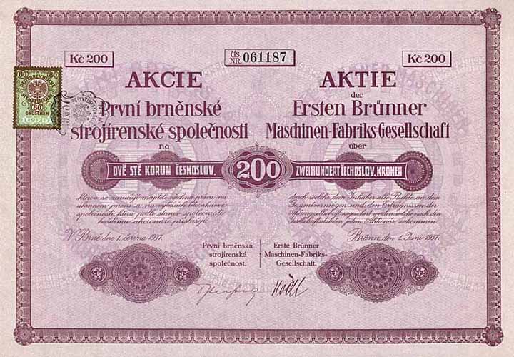 | Vorheriges Los | Zurück | Nächstes Los | | Losnr.: | 622 (k.u.k Monarchie / Nachfolgestaaten) | | Titel: | Erste Brünner Maschinen-Fabriks-Gesellschaft | | Auflistung: | Aktie 200 Kr. 1.6.1937. | | Ausruf: | 40,00 EUR | Ausgabe- datum: | 01.06.1937 | Ausgabe- ort: | Brünn | | Abbildung: |  | | Stücknr.: | 61191 | | Info: | Gründung 1872 durch Zusammenschluss der 1821 gegründeten Firma H.A. Luz und der 1844 gegründeten Firma Bracegirdle & Sohn. Herstellung von Dampfturbinen, Dampfmaschinen, Kesseln, Einrichtungen für die Zuckerfabrikation und für keramische Werke, Kühlanlagen, Straßenwalzen, Brauereieinrichtungen und Kompressoren. | | Besonder-heiten: | Zweisprachig tschechisch/deutsch. | | Erhaltung: | Doppelblatt, mit restlichem Kuponbogen. EF+. | | Zuschlag: | offen |