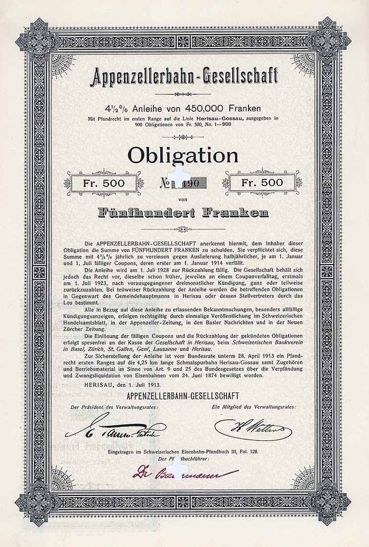 | Vorheriges Los | Zurück | Nächstes Los | | Losnr.: | 857 (Schweiz) | | Titel: | Appenzellerbahn-Gesellschaft | | Auflistung: | 4,5 % Obl. 500 Fr. 1.7.1913 (Auflage 900). | | Ausruf: | 75,00 EUR | Ausgabe- datum: | 01.07.1913 | Ausgabe- ort: | Herisau | | Abbildung: |  | | Stücknr.: | 490 | | Info: | Ab 1875 wurde die Strecke Winkeln-Herisau-Urnäsch mit einer Gesamtlänge von 32 km schrittweise eröffnet. 1885 kam es zur Zwangsliquidation, die Dank finanzieller Hilfe von Gemeinden und Privaten aufgehoben wurde. 1912 Eröffnung der Strecke Appenzell-Wasserauen, ab 1913 Anschluss an die Bundesbahnen in Gossau. Ab 1933 elektrischer Betrieb. 1988 Fusion der Appenzeller Bahn und der St. Gallen-Gais-Appenzell-Altstätten (SGA). | | Erhaltung: | Rechter Rand uneben durch das Abschneiden der Kupons. Lochentwertet. EF. | | Zuschlag: | offen |