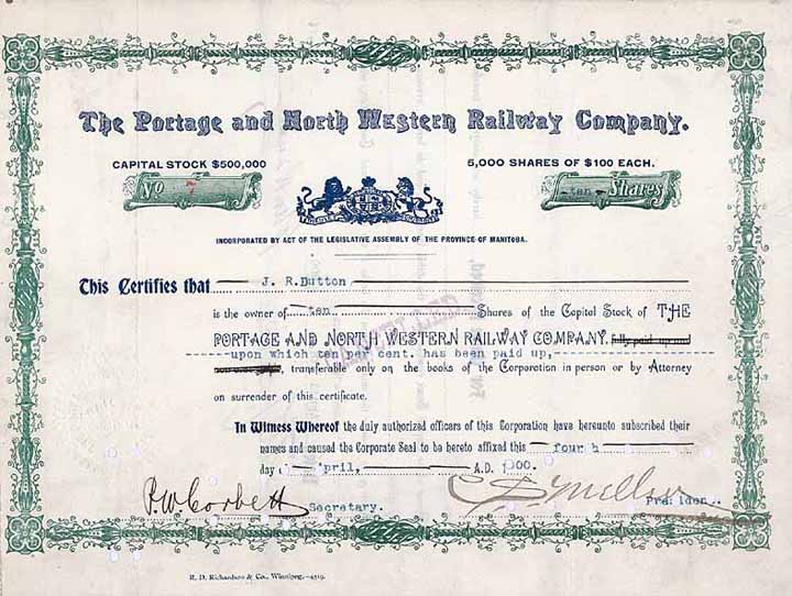 | Vorheriges Los | Zurück | Nächstes Los | | Losnr.: | 242 (U.S.A.) | | Titel: | Portage & North Western Railway | | Auflistung: | 10 shares à 100 $ 4.4.1900. | | Ausruf: | 240,00 EUR | Ausgabe- datum: | 04.04.1900 | | Abbildung: |  | | Stücknr.: | 7 | | Info: | Gegründet 1899 mit juristischem Sitz im kanadischen Winnipeg zur Verlängerung der “Winnipeg Line”, der wichtigsten, nach Norden bis in die kanadische Provinz Manitoba führenden Northern-Pacific-Zweigbahn. Die Strecke verzweigte sich nordwestlich von Winnipeg in Portage-la-Prairie: Ein Arm führte Richtung Norden nach Delta am Südufer des Lake Manitoba, der zweite Arm weiter nordwestlich nach Beaver. Mitte 1901 verpachtete die NP alle auf kanadischem Territorium liegenden Strecken ihrer wichtigsten Flügelbahn auf 999 Jahre an die Provinzregierung von Manitoba. | | Besonder-heiten: | Hübscher Druck in grün und blau, Umrahmung in Säulenform. | | Verfügbar: | Gerade einmal 11 ausgestellte Stücke wurden im NP-Archiv gefunden. | | Erhaltung: | VF+. | | Zuschlag: | offen |