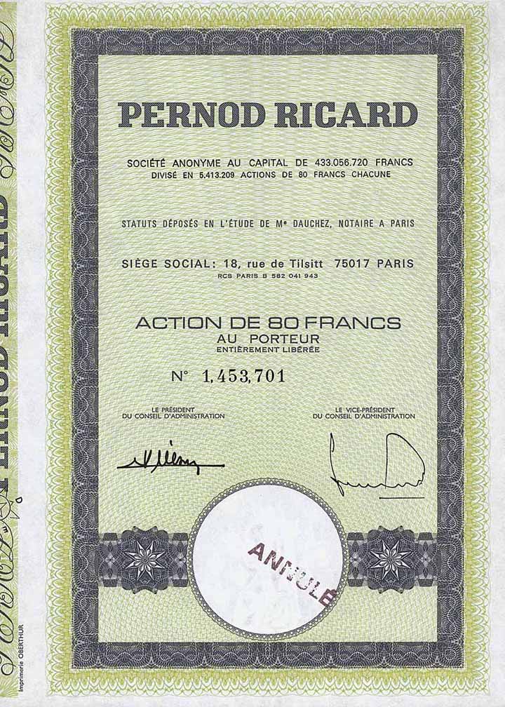 | Vorheriges Los | Zurück | Nächstes Los | | Losnr.: | 456 (Frankreich) | | Titel: | Pernod Ricard S.A. | | Auflistung: | Action 80 F ca. 1980. | | Ausruf: | 30,00 EUR | Ausgabe- datum: | 01.01.1980 | Ausgabe- ort: | Paris | | Abbildung: |  | | Stücknr.: | 1453702 | | Info: | Groß wurde der Firmengründer Paul Ricard in den 30er Jahren mit dem Anisschnaps Pastis, den er mit cleveren Werbegags von Marseille aus auf die Bistrotheken in ganz Frankreich brachte. Als in den 50er Jahren Benzin knapp war, schickte Ricard eine Dromedar-Karawane durch’s Land, um die Kneipen zu beliefern - die “Karawane des Dursts. Als Ricard 1974 mit dem Erzkonkurrenten Pernod verschmolz, wurde aus dem Mittelständler ein Konzern. Nach der Ende 2001 erfolgten Übernahme des Spritituosen-Geschäfts des kanadischen Konkurrenten Seagram ist Pernod-Ricard heute mit einem Jahresumsatz von fast 5 Mrd. € im Geschäft mit Wein und Spirituosen das größte Unternehmen der Welt. Der Börsenwert beträgt über 6 Mrd. €, seit Juli 2003 notiert Pernod-Ricard sogar im Pariser Leitindex CAC 40. | | Verfügbar: | Extrem selten. | | Erhaltung: | EF. | | Zuschlag: | 33,00 EUR |