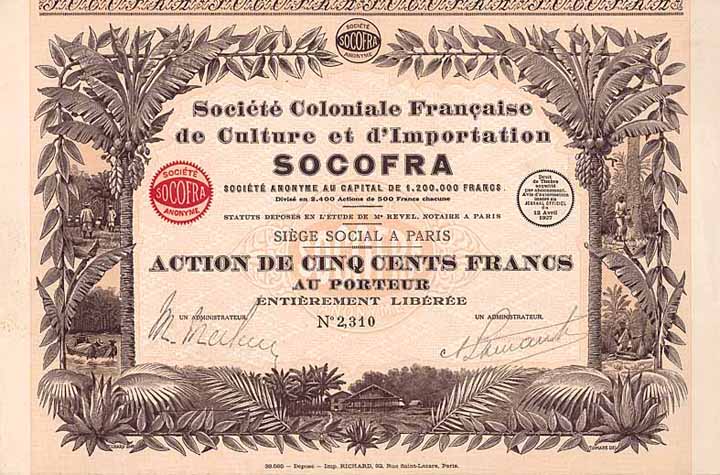 | Vorheriges Los | Zurück | Nächstes Los | | Losnr.: | 467 (Frankreich) | | Titel: | Soc. Coloniale Francaise de Culture et d’Importation SOCOFRA | | Auflistung: | Action 500 F 12.4.1927 (Auflage 2400). | | Ausruf: | 75,00 EUR | Ausgabe- datum: | 12.04.1927 | Ausgabe- ort: | Paris | | Abbildung: |  | | Stücknr.: | 2310 | | Besonder-heiten: | Äußerst dekorative Gestaltung, Umrandung aus Palmen, mehrere Abb. von Schwarzafrikanern bei der Arbeit. Gestaltet von Tomasz (in der Platte signiert ). | | Erhaltung: | Anh. Kupons. EF-VF. | | Zuschlag: | offen |
