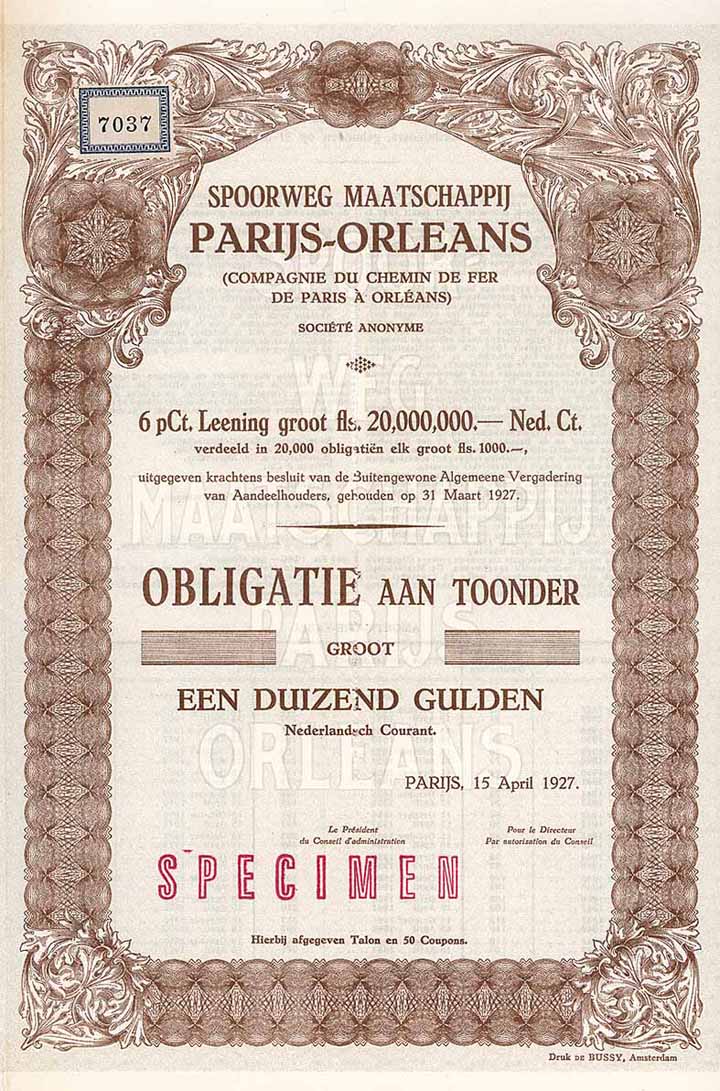 | Vorheriges Los | Zurück | Nächstes Los | | Losnr.: | 481 (Frankreich) | | Titel: | Spoorweg Maatschappij Parijs-Orleans (Cie, du Chemin de Fer de Paris à Orléans S.A.) | | Auflistung: | 6 % Obl. 1.000 fl. 15.4.1927 (Specimen). | | Ausruf: | 150,00 EUR | Ausgabe- datum: | 15.04.1927 | Ausgabe- ort: | Paris | | Abbildung: |  | | Info: | Eine der fünf großen Eisenbahngesellschaften Frankreichs, Strecke Paris nach Orleans mit Abzweigen nach Nevers, Roanne, Clermont, Limoges, Bordeaux und Nantes. | | Besonder-heiten: | Teil einer Anleihe von 20 Mio. fl., aufgenommen auf dem niederländischen Finanzmarkt. | | Verfügbar: | Äußerst seltenes Belegexemplar aus dem De Bussy-Archiv. | | Erhaltung: | Perforiert. EF. | | Zuschlag: | 150,00 EUR |