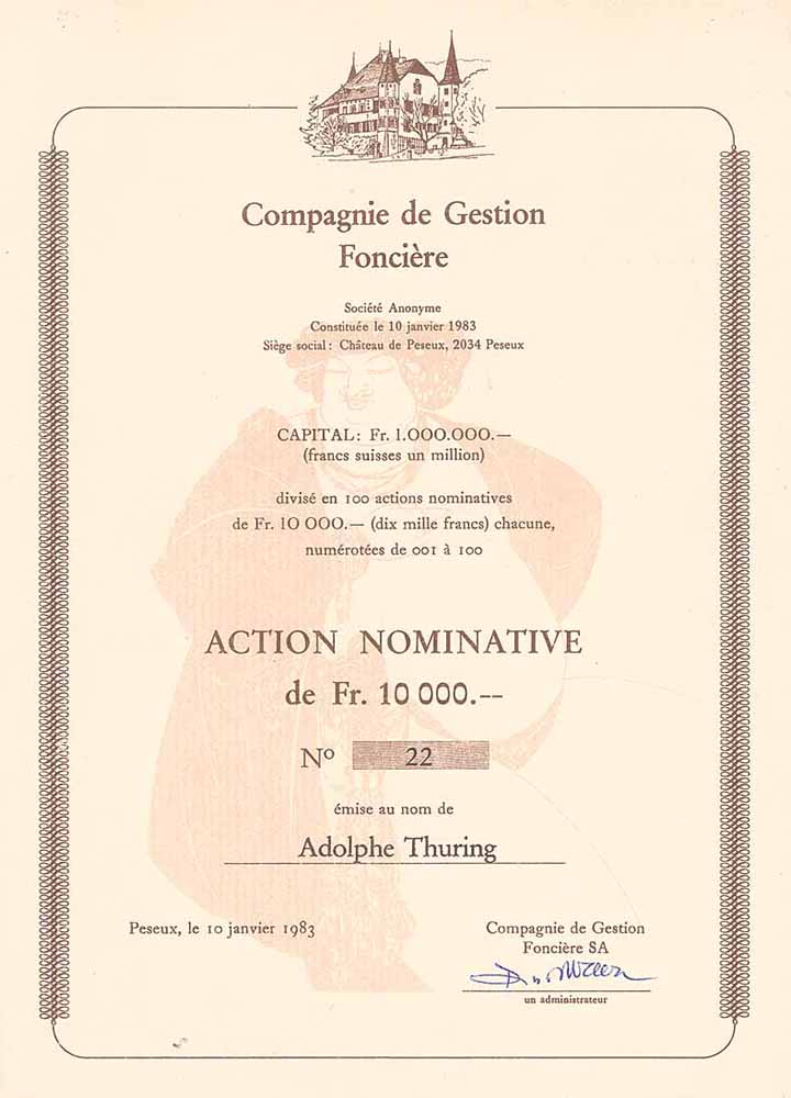 | Vorheriges Los | Zurück | Nächstes Los | | Losnr.: | 580 (Schweiz) | | Titel: | Cie. de Gestion Foncière S.A. | | Auflistung: | Action 10.000 Fr. 10.1.1983. Gründeraktie (Auflage 100). | | Ausruf: | 60,00 EUR | Ausgabe- datum: | 10.01.1983 | Ausgabe- ort: | Peseux | | Abbildung: |  | | Stücknr.: | 22 | | Info: | Immobiliengesellschaft, gegründet 1983. | | Besonder-heiten: | Kunst auf Wertpapieren! Aktiengestaltung nach Entwurf des bekannten Jugendstilkünstlers Aubrey Vincent Beardsley. Die Illustration auf der Aktie wurde von Beardsley ursprünglich für das „Ali Baba”-Buch gezeichnet. Druck auf Büttenpapier. | | Verfügbar: | Seit Jahren nicht mehr angeboten. | | Erhaltung: | EF+. | | Zuschlag: | 60,00 EUR |