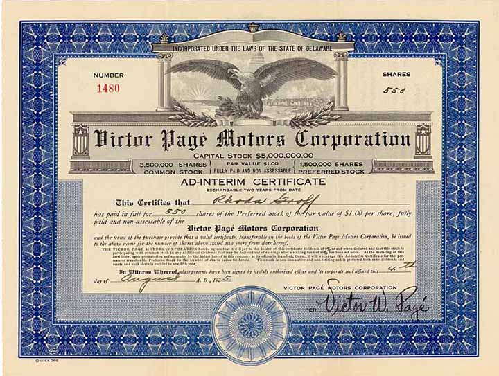 | Vorheriges Los | Zurück | Nächstes Los | | Losnr.: | 720 (USA) | | Titel: | Victor Pagé Motors Corp. | | Auflistung: | 550 pref. shares à 1 $ 4.8.1925. | | Ausruf: | 50,00 EUR | Ausgabe- datum: | 04.08.1925 | Ausgabe- ort: | Delaware | | Abbildung: |  | | Stücknr.: | 1206 | | Info: | Als Autor von Automobil-Fachbüchern eignete sich Victor Pagé das nötige theoretische Wissen an, im 1. Weltkrieg war er Pilotenausbilder, später Herausgeber des Magazins “Scientific American”. Erfahrungen im Automobilbau hatte Pagé bereits mit der Pagé Motor Vehicle Co. gesammelt, ehe er 1921 diese Ges. mit juristischem Sitz in der Steueroase Delaware gründete. Die Fabrik entstand in Farmingdale, N.Y. Die Bilder der “Erlkönige” zeigten sehr fortschrittliche Fahrzeuge für vier Insassen, als Roadstar und als Coupé. Sie wurden 1922 auf der New York Automobil Show vorgestellt. Tatsächlich wurden von diesen Autos aber nur ganze 5 Stück produziert, danach stellte Pagé die Produktion auf den kleineren "Utility" um, zugleich Einrichtung eines neuen Werkes in Stamford, Ct. Nach Aktionärsklagen endete die Produktion mit nur 128 gebauten Autos im Okt. 1923. | | Besonder-heiten: | Mit Originalunterschrift Major Victor W. Pagé. Vignette mit Weißkopfseeadler, Stadtsilhouette im Hintergrund. | | Erhaltung: | VF+ | | Zuschlag: | 50,00 EUR n |