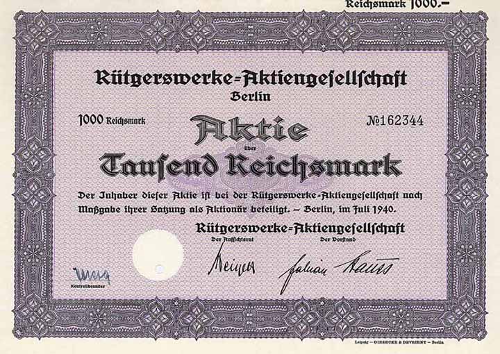 | Vorheriges Los | Zurück | Nächstes Los | | Losnr.: | 1669 (Deutschland 1924-1945 (III. Reich)) | | Titel: | Rütgerswerke AG | | Auflistung: | Aktie 1.000 RM Juli 1940 (Auflage 1800, R 2). | | Ausruf: | 45,00 EUR | Ausgabe- datum: | 01.07.1940 | Ausgabe- ort: | Berlin | | Abbildung: |  | | Stücknr.: | 162343 | | Info: | Gegründet 1849 von Julius Rütgers als eine Firma die mit Teeröl als Holzschutzmittel für Eisenbahnschwellen handelte, aus der 1898 die "AG für Holzverwertung und Imprägnierung" entstanden ist, 1902 umbenannt wie oben. 20 Teerproduktenfabriken, Fabriken künstlicher Kohlen und Holzimprägnieranstalten im ganzen Reichsgebiet, Flußspatbergwerk im Kreis Ballenstedt und Chemische Fabriken bei Siptenfelde, Dresden und Gleiwitz. Gepachtet waren außerdem die Werke der Chemische Fabrik Weyl AG in Waldhof bei Mannheim und der “Silesia” Verein chemischer Fabriken bei Saarau, Breslau und Dittersbach (an beiden AG’s besaßen die Rütgerwerke auch über 90 % der Aktien). Eine 1923 geplante Fusion mit der Deutsche Petroleum AG scheiterte an steuerlichen Hindernissen, stattdessen Interessengemeinschaft mit wechselseitiger Beteiligung. 1947 Sitzverlegung nach Frankfurt (Main). 1995 Umfirmierung in RÜTGERS AG und Sitzverlegung nach Essen zum Sitz des Großaktionärs (über 98 %) Ruhrkohle. | | Besonder-heiten: | Lochentwertet (RB). | | Verfügbar: | R 2 | | Erhaltung: | UNC-EF. | | Zuschlag: | 45,00 EUR |