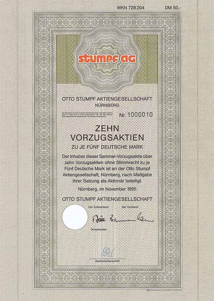 | Vorheriges Los | Zurück | Nächstes Los | | Losnr.: | 1860 (Deutschland 1948-2000 (Die Deutsche Mark)) | | Titel: | Otto Stumpf AG | | Auflistung: | VZ-Aktie 10 x 5 DM Nov. 1995. | | Ausruf: | 60,00 EUR | Ausgabe- datum: | 01.11.1995 | Ausgabe- ort: | Nürnberg | | Abbildung: |  | | Stücknr.: | 1000010 | | Info: | Gründung 1919 in Chemnitz, AG seit 1922. Schon damals eine der bedeutendsten pharmazeutischen Großhandlungen. 1939 Angliederung der Firma Ludwig Merckle in Aussig. Börsennotiz Leipzig. Heutiger Firmensitz ist Nürnberg. | | Erhaltung: | Rückseitig entwertet. UNC. | | Zuschlag: | offen |
