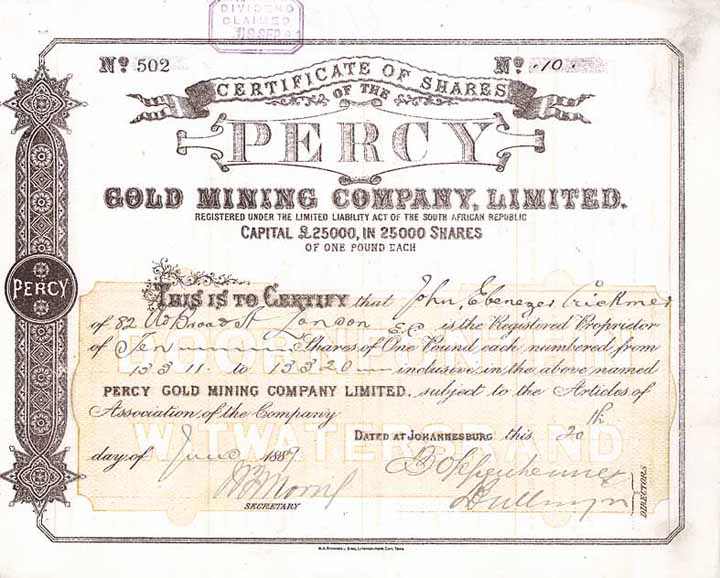 | Vorheriges Los | Zurück | Nächstes Los | | Losnr.: | 1041 (Verschiedene Länder) | | Titel: | Percy Gold Mining Co. Ltd. | | Auflistung: | 10 shares à 1 £ 20.6.1889. | | Ausruf: | 150,00 EUR | Ausgabe- datum: | 20.06.1889 | Ausgabe- ort: | Johannesburg | | Abbildung: |  | | Stücknr.: | 13311-13320 | | Info: | Die größten Goldressourcen der Welt wurden in der Gegend von Witwatersrand gefunden und daher ist es kein Wunder, dass Südafrika führend ist beim Goldabbau. Johannesburg’s anderer Name “Egoli” bedeutet Straße des Goldes. | | Erhaltung: | EF. | | Zuschlag: | 160,00 EUR |