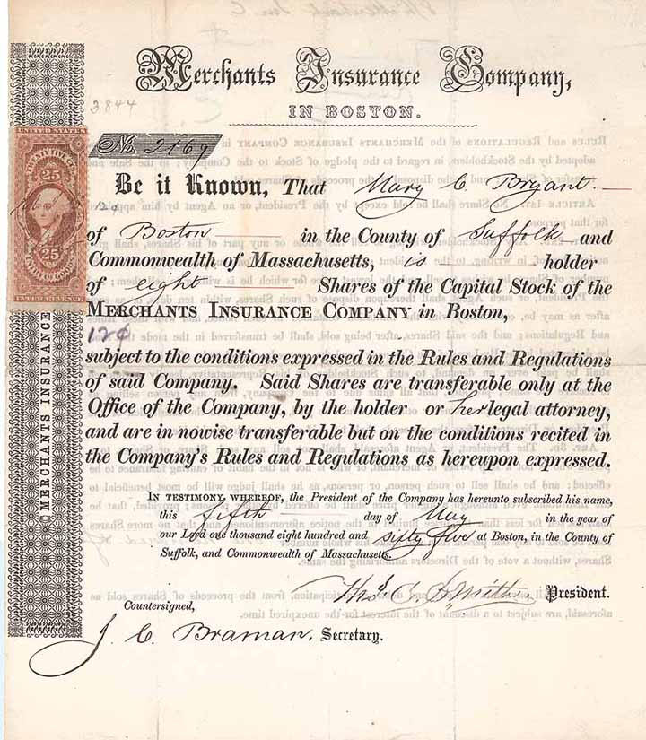 | Vorheriges Los | Zurück | Nächstes Los | | Losnr.: | 127 (U.S.A.) | | Titel: | Merchants Insurance Co. | | Auflistung: | 8 shares of capital stock 5.5.1865. | | Ausruf: | 150,00 EUR | Ausgabe- datum: | 05.05.1865 | Ausgabe- ort: | Boston | | Abbildung: |  | | Stücknr.: | 2169 | | Besonder-heiten: | Ein recht früher Versicherungstitel. Rückseitig Auszug aus den Statuten mit handschriftlicher Ergänzung, daß maximal 150 shares den Besitzer wechseln können ohne Zustimmung des Direktoriums. | | Verfügbar: | Äußerst selten. | | Erhaltung: | EF-VF. | | Zuschlag: | offen |