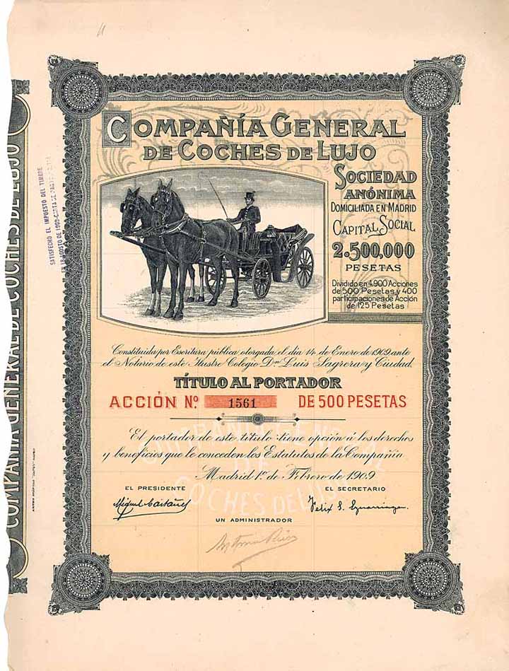 | Vorheriges Los | Zurück | Nächstes Los | | Losnr.: | 1014 (Spanien) | | Titel: | Cia. General de Coches de Lujo S.A. | | Auflistung: | Accion 500 ptas. 1.2.1909 (Auflage 4900). | | Ausruf: | 70,00 EUR | Ausgabe- datum: | 01.02.1909 | Ausgabe- ort: | Madrid | | Abbildung: |  | | Stücknr.: | 1561 | | Info: | Manufaktur für den Bau von Luxuskutschen, gegründet im Jan. 1909 mit einem Kapital von 2,5 Mio. Pesetas. | | Besonder-heiten: | Sehr dekorative Gestaltung mit Jugendstil-Elementen, große Vignette mit offenem, pferdespanntem Landauer. | | Erhaltung: | EF. | | Zuschlag: | offen |