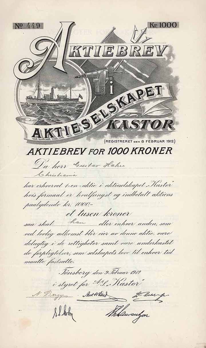 | Vorheriges Los | Zurück | Nächstes Los | | Losnr.: | 987 (Skandinavien) | | Titel: | A/S “Kastor” | | Auflistung: | Aktie 1.000 nkr. 9.2.1912. Gründeraktie (Auflage 800). | | Ausruf: | 125,00 EUR | Ausgabe- datum: | 09.02.1912 | Ausgabe- ort: | Tönsberg | | Abbildung: |  | | Stücknr.: | 464 | | Info: | Alte Walfanggesellschaft, die fast 40 Jahre lang von Tönsberg aus im Atlantik auf Walfang ging. Mit dem Walfangverbot 1950 wurde die Gesellschaft aufgelöst. | | Besonder-heiten: | Sehr dekorativ mit Vignette eines Walfangdampfschiffes, Harpune und Flagge. | | Erhaltung: | Mit anh. Statuten. Leichte Strichentwertung. EF-VF. | | Zuschlag: | offen |
