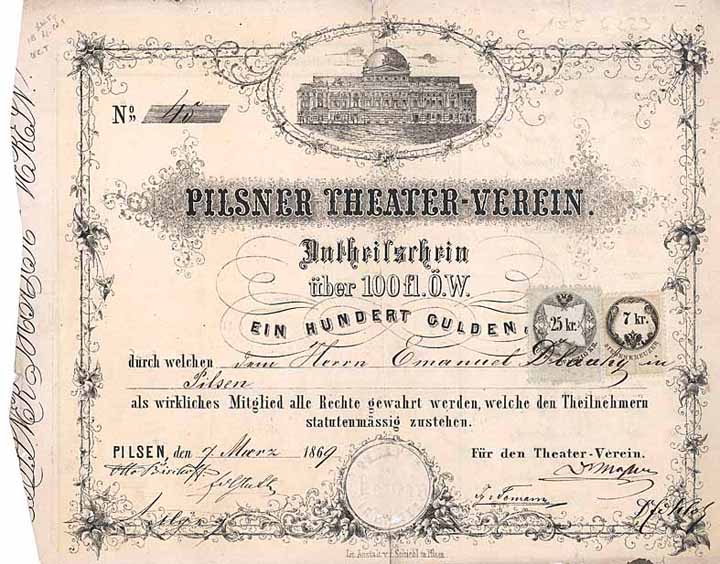 | Vorheriges Los | Zurück | Nächstes Los | | Losnr.: | 621 (k.u.k Monarchie / Nachfolgestaaten) | | Titel: | Pilsner Theater-Verein | | Auflistung: | Antheilschein 100 Gulden 7.3.1869. | | Ausruf: | 2.200,00 EUR | Ausgabe- datum: | 07.03.1869 | Ausgabe- ort: | Pilsen | | Abbildung: |  | | Stücknr.: | 45 | | Info: | Die Anfänge der tschechischen Bühnenkunst in Pilsen liegen in der ersten Hälfte des 19. Jh. Damals wurde inSälen von Gasthäusern, aber auch im großen Saal des Pilsner Rathauses gespielt. Ab 1832 fanden in einem heute nicht mehr existierenden Theater, im Gebäude, an dessen Stelle jetzt die heutige Technische Fakultät steht, Theateraufführungen statt. Am 1. November 1865 eröffnete der Theaterdirektor Pavel Svanda die erste tschechische Bühnensaison mit Shakespeares Tragödie “Romeo und Julia”. Die deutsche Bevölkerung Pilsens wollte diesem Theater etwas entgegensetzen und so wurde 1869 das Deutsche Theater Pilsen eröffnet, das aber in den 70er Jahren des 20. Jh. abgerissen wurde, an seiner Stelle entstand ein Bankgebäude. 1902 schließlich wird der Theaterbetrieb im “Städtischen Theater”, heute “Großes Theater” feierlich aufgenommen. Das Theater setzt sich heute aus 4 Ensembles zusammen: Oper, Operette, Sprechtheater und Ballett. Die Pilsner Theaterensembles erfreuen sich auch im deutschsprachigen Raum wachsender Beliebtheit. | | Besonder-heiten: | Umrandung mit Blüten, mit Abb. des prächtigen Theatergebäudes. | | Verfügbar: | Rarität. | | Erhaltung: | VF. | | Zuschlag: | 3.000,00 EUR |