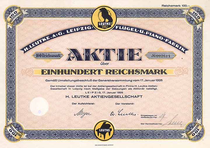 | Vorheriges Los | Zurück | Nächstes Los | | Losnr.: | 1488 (Deutschland 1924-1945 (III. Reich)) | | Titel: | H. Leutke AG | | Auflistung: | Aktie 100 RM 17.1.1925 (Auflage 6000, R 6). | | Ausruf: | 100,00 EUR | Ausgabe- datum: | 17.01.1925 | Ausgabe- ort: | Leipzig | | Abbildung: |  | | Stücknr.: | 2614 | | Info: | Gründung 1921 zur Fortführung der H. Leutke GmbH Flügel- und Pianofabrik in Leipzig, Wilhelmstr. 8/18 mit 200 Mitarbeitern. Börsennotiz: Freiverkehr Leipzig. Zahlungsschwierigkeiten erzwangen 1925 einen Sanierungsplan, wonach die Gläubiger mit 20 % abgelöst werden sollten. Da sich aber die frühere Hausbank querstellte, kam der Betrieb trotz genügender Aufträge nicht wieder in Gang, 1927 Konkurs. | | Besonder-heiten: | Vignetten mit einem Löwen und Piano. Lochentwertet (RB). | | Verfügbar: | R 6 | | Erhaltung: | EF. | | Zuschlag: | offen |