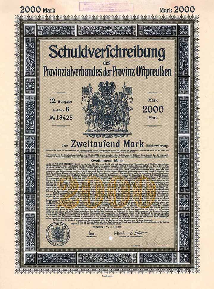 | Vorheriges Los | Zurück | Nächstes Los | | Losnr.: | 1348 (Deutschland 1919-1923 (Die Inflation)) | | Titel: | Provinzialverband der Provinz Ostpreußen | | Auflistung: | 4,5 % Schuldv. 2.000 Mark 1.7.1921 (R 6). | | Ausruf: | 40,00 EUR | Ausgabe- datum: | 01.07.1921 | Ausgabe- ort: | Königsberg i.Pr. | | Abbildung: |  | | Stücknr.: | 13425 | | Info: | Die stark besitzständisch geprägte Provinzverfassung nach der Hardenbergschen Staatsreform von 1823 wurde 1875-88 ersetzt durch die Provinzialverordnungen, die dem Freiherr vom Stein’schen Gedanken der Selbstverwaltung stärker Rechnung trugen. Seitdem waren die Provinzen sowohl staatliche Verwaltungseinheiten (in Regierungsbezirke und Kreise unterteilt) als auch kommunale Selbstverwaltungskörperschaften (Provinzialverbände). Die Organe der Provinzialverbände waren 1. der Provinziallandtag (an Stelle der alten Provinzialstände) als Legislativorgan, seine Abgeordneten wurden von den Stadt- und Landkreisen gewählt (seit 1925 unmittelbar vom Volk); 2. der aus seiner Mitte gewählte Provinzialausschuss als Exekutivorgan; 3. der vom Provinziallandtag auf 6-12 Jahre gewählte Landesdirektor oder Landeshauptmann, der zusammen mit den Landesräten die laufenden Geschäfte erledigte und den Provinzialverband nach außen vertrat. Nach 1918 nahmen die politischen Aufgaben des Provinziallandtages noch zu. Unter dem Nationalsozialismus wurden 1933 zunächst die Organe der Provinzialverbände aufgelöst, nach 1945 verschwanden auch die Provinzialverbände selbst. | | Besonder-heiten: | Lochentwertet (RB). | | Verfügbar: | R 6 | | Erhaltung: | EF. | | Zuschlag: | offen |