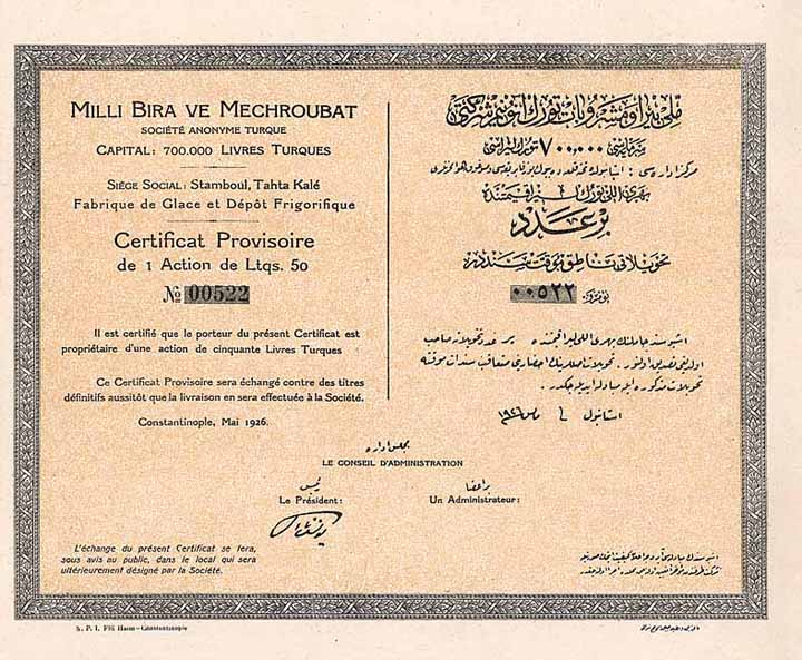 | Vorheriges Los | Zurück | Nächstes Los | | Losnr.: | 1695 (Brauerein zum halben Ausruf) | | Titel: | Milli Bira ve Mechroubat S.A. Turque | | Auflistung: | Aktie (cert. prov.) 50 £ tq. Mai 1926. Gründeraktie (nicht im Drumm/Henseler-Katalog). | | Ausruf: | 15,00 EUR | Ausgabe- datum: | 01.05.1926 | Ausgabe- ort: | Konstantinopel | | Abbildung: |  | | Stücknr.: | 522 | | Info: | Eisfabrik und Kühlhaus in Stamboul. | | Besonder-heiten: | Zweisprachig französisch/ottomanisch. | | Erhaltung: | EF. | | Zuschlag: | offen |