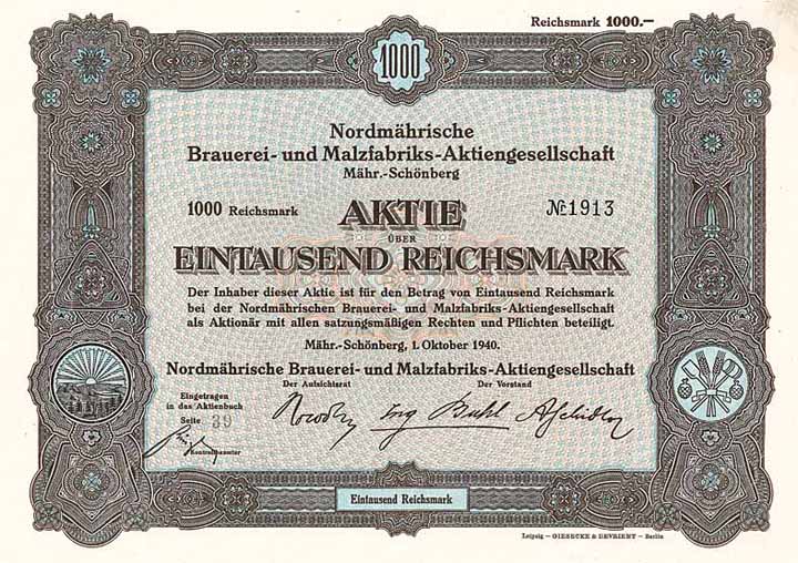 | Vorheriges Los | Zurück | Nächstes Los | | Losnr.: | 1702 (Brauerein zum halben Ausruf) | | Titel: | Nordmährische Brauerei- und Malzfabriks-AG | | Auflistung: | Aktie 1.000 RM 1.10.1940 (Auflage 2800, R 8). | | Ausruf: | 60,00 EUR | Ausgabe- datum: | 01.10.1940 | Ausgabe- ort: | Mähr.-Schöneberg | | Abbildung: |  | | Stücknr.: | 1914 | | Info: | Bei der Gründung 1906 wurden die Brauereien Anton Wlach & Cie. in Mährisch-Schönberg, Chiari & Cie. in Hannsdorf-Halbseit und Dr. Ulrich & Co. in Johrnsdorf erworben. An allen drei Standorten blieben die Mälzereien bis zur Verstaatlichung nach 1945 in Betrieb, der Braubetrieb war schon zuvor in Hannsdorf konzentriert worden. 1937 noch Übernahme der Sternberger Bierbrauerei. Beschäftigt wurden zuletzt zusammen etwa 300 Mitarbeiter. | | Besonder-heiten: | Sehr schöner Druck von G&D mit zwei Vignetten. | | Verfügbar: | R 8 | | Erhaltung: | EF. | | Zuschlag: | 60,00 EUR |
