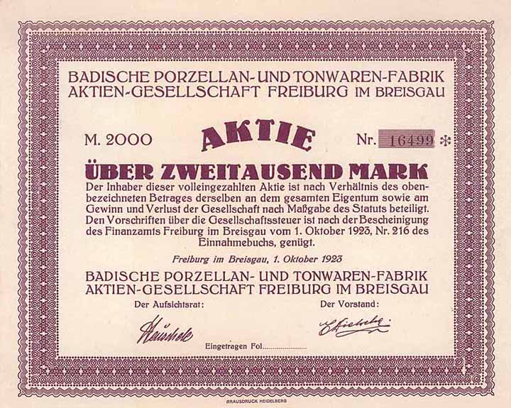 | Vorheriges Los | Zurück | Nächstes Los | | Losnr.: | 926 (Deutschland 1919-1923 (Die Inflation)) | | Titel: | Badische Porzellan- und Tonwaren-Fabrik AG | | Auflistung: | Aktie 2.000 Mark 1.10.1923 (R 10). | | Ausruf: | 125,00 EUR | Ausgabe- datum: | 01.10.1923 | Ausgabe- ort: | Freiburg im Breisgau | | Abbildung: |  | | Stücknr.: | 16499 | | Info: | Gründung im Mai 1923. Die Fabrik für Tonwaren, Steingut und Porzellan war in der Zähringerstr. 101. AG schon Ende 1925 wieder aufgelöst. | | Verfügbar: | R 10 | | Erhaltung: | Mit kpl. anh. Kupons. EF+. | | Zuschlag: | offen |