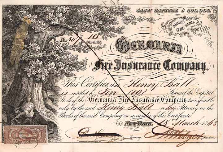 | Vorheriges Los | Zurück | Nächstes Los | | Losnr.: | 60 (U.S.A.) | | Titel: | Germania Fire Insurance Co. | | Auflistung: | 10 shares à 50 $ 18.3.1863. | | Ausruf: | 160,00 EUR | Ausgabe- datum: | 18.03.1863 | Ausgabe- ort: | New York | | Abbildung: |  | | Stücknr.: | 307 | | Besonder-heiten: | Wunderschön gestalteter Versicherungswert: ein knorriger Eichenwald ist über die ganze Höhe der Aktie abgebildet, zu Füßen des vordersten Baumes lagert die Germania mit Schild und Schwert. | | Erhaltung: | EF-VF. | | Zuschlag: | offen |
