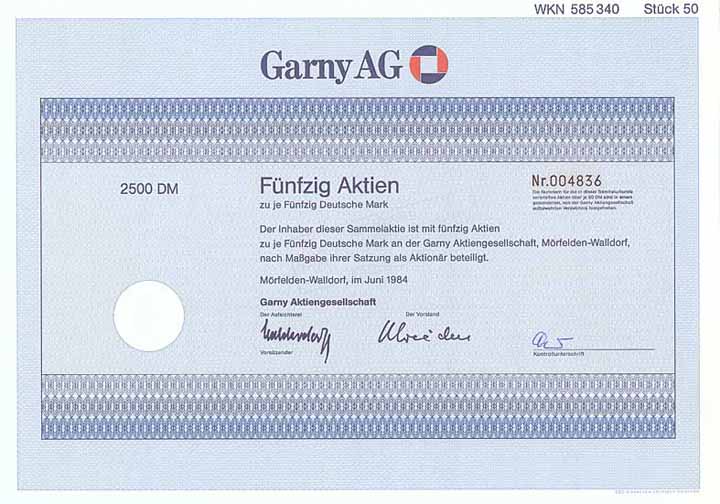 | Vorheriges Los | Zurück | Nächstes Los | | Losnr.: | 1618 (Deutschland 1948-2000 (Die Deutsche Mark)) | | Titel: | Garny AG | | Auflistung: | Sammelaktie 50 x 50 DM Juni 1984. | | Ausruf: | 25,00 EUR | Ausgabe- datum: | 01.06.1984 | Ausgabe- ort: | Mörfelden-Walldorf | | Abbildung: |  | | Stücknr.: | 3084 | | Info: | Die AG geht auf den 1813 durch Johann Georg Garny in Frankfurt a.M. gegründeten Schlossereibetrieb für Kassenschrank-Fabrikation zurück. Die Firma war die erste deutsche Kassenschrankfabrik überhaupt und entwickelte sich zu einem der größten Geldschrank- und Tresorhersteller. 1937 Umwandlung in eine Kommanditgesellschaft, 1938 Einweihung eines neuen Werkes in Niedrrad. 1972 wurde der Betrieb nach Mörfelden verlegt. 1984 Umwandlung in die Garny AG und Börsengang. Garny stellt jetzt neben Geldschränken und Tresoren auch Einrichtungssysteme für Banken und elektronische Bargeld- und Sicherheitssysteme her. 1998 Übertragung des operativen Geschäfts auf die schwedische Gunnebo-Gruppe bzw. den neuen Großaktionär De La Rue, zugleich Umfirmierung in IMW Immobilien AG. Noch heute börsennotiert. | | Erhaltung: | Rückseitig entwertet. EF. | | Zuschlag: | 25,00 EUR |