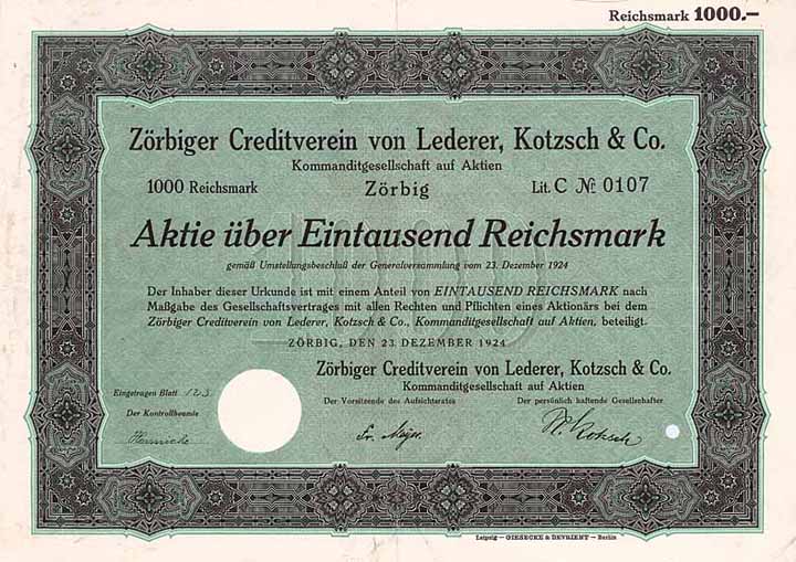 | Vorheriges Los | Zurück | Nächstes Los | | Losnr.: | 1543 (Deutschland 1924-1945 (III. Reich)) | | Titel: | Zörbiger Creditverein von Lederer, Kotzsch & Co. KGaA | | Auflistung: | Aktie 1.000 RM 24.12.1924 (R 7). | | Ausruf: | 80,00 EUR | Ausgabe- datum: | 24.12.1924 | Ausgabe- ort: | Zörbig | | Abbildung: |  | | Stücknr.: | 107 | | Info: | Gründung 1889, neben Bankgschäften auch Lager und Verkauf von Getreide, Futter, Düngemitteln. | | Besonder-heiten: | Lochentwertet (RB). | | Verfügbar: | R 7 | | Erhaltung: | EF-VF. | | Zuschlag: | offen |