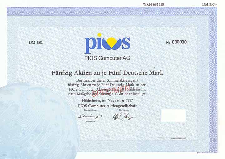 | Vorheriges Los | Zurück | Nächstes Los | | Losnr.: | 1821 (Deutschland 1948-2000 (Die Deutsche Mark)) | | Titel: | Pios Computer AG | | Auflistung: | Aktie 50 x 5 DM Nov. 1997 (nullgeziffertes Muster). | | Ausruf: | 70,00 EUR | Ausgabe- datum: | 01.11.1997 | Ausgabe- ort: | Hildesheim | | Abbildung: |  | | Info: | Gegründet am 15.5.1996. Bereits im Gründungsjahr machte die Firma von sich reden, als sie auf der CEBIT in Hannover unter Apple-Lizenz von Umax hergestellten Mac-Clones vorstellte. 1999 von der NORD LB an die Börse gebracht. Sie firmierte jetzt als Met@box AG. Die Pseudo-High-Tech-Schmiede erfand Scheinprodukte und Scheinkunden, u.a. 2001 Grossauftrag aus Israel für ihre TV-Metaboxen. Heute Met@box AG i.K. | | Erhaltung: | Mit kpl. Kuponbogen. UNC. | | Zuschlag: | 70,00 EUR n |