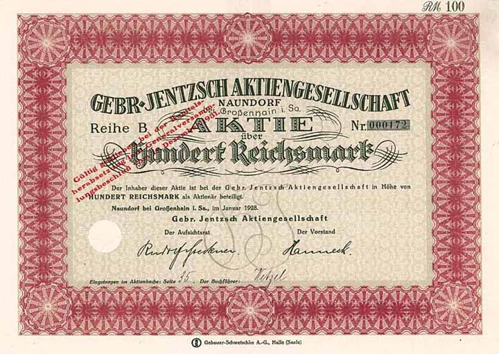 | Vorheriges Los | Zurück | Nächstes Los | | Losnr.: | 1422 (Deutschland 1924-1945 (III. Reich)) | | Titel: | Gebr. Jentzsch AG | | Auflistung: | Aktie Reihe B 100 RM Jan. 1928 (Auflage 1600, R 10). | | Ausruf: | 100,00 EUR | Ausgabe- datum: | 01.01.1928 | Ausgabe- ort: | Naundorf bei Großenhain i.Sa. | | Abbildung: |  | | Stücknr.: | 172 | | Info: | Gründung 1843 in Halle a.S., AG seit 1916. Betrieb einer Stoffdruckerei und Färberei. Bis 1932 in Halle börsennotiert. Nach 1949 verlegt nach Hannover, 1969 gelöscht. 1993 Fortsetzung der Gesellschaft (Amtsgericht Dresden), 1997 nach Abwicklung wegen Vermögenslosigkeit gelöscht. | | Verfügbar: | R 10 | | Erhaltung: | Mit Kupons. VF. | | Zuschlag: | offen |