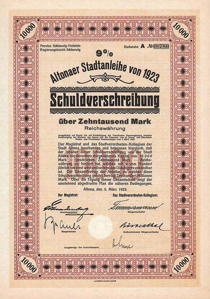 | Vorheriges Los | Zurück | Nächstes Los | | Losnr.: | 758 (Halber Ausruf) | | Titel: | Stadt Altona | | Auflistung: | 9 % Schuldv. 10.000 Mark 5.3.1923 (R 9). | | Ausruf: | 35,00 EUR | Ausgabe- datum: | 05.03.1923 | Ausgabe- ort: | Altona | | Abbildung: |  | | Stücknr.: | 8878 | | Besonder-heiten: | Teil einer Anleihe von 300 Mio. M, ausgegeben von der Stadt Altona bevor sie ihre Selbständigkeit verlor und ein Teil von Hamburg wurde. Sehr dekorativ. | | Verfügbar: | Ohne Lochentwertung. (R 9) | | Erhaltung: | Mit Kuponbogen. EF. | | Zuschlag: | 37,00 EUR |