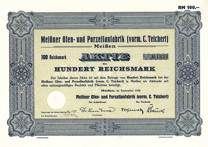 | Vorheriges Los | Zurück | Nächstes Los | | Losnr.: | 956 (Dresden) | | Titel: | Meißner Ofen- und Porzellanfabrik (vorm. C. Teichert) | | Auflistung: | Aktie 100 RM Sept. 1934 (Auflage 3400, R 2). | | Ausruf: | 30,00 EUR | Ausgabe- datum: | 01.09.1934 | Ausgabe- ort: | Meißen | | Abbildung: |  | | Stücknr.: | 8777 | | Info: | Gründung 1872. Herstellung von Kacheln, Wandplatten und Schamotteerzeugnissen. Börsennotiz Berlin, Dresden/Leipzig. Tochtergesellschaften: Ernst Teichert GmbH und Meißner Wandplattenwerke Saxonia GmbH, beide in Meißen ansässig. | | Besonder-heiten: | Lochentwertet (RB). | | Verfügbar: | R 2 | | Erhaltung: | EF+. | | Zuschlag: | offen |