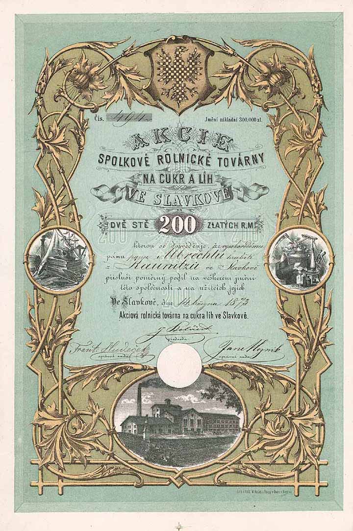 | Vorheriges Los | Zurück | Nächstes Los | | Losnr.: | 361 (k.u.k Monarchie / Nachfolgestaaten) | | Titel: | Zuckerfabrik in Austerlitz (Spolkové Rolnické Továrny na Cukra lih ve Slavkove) | | Auflistung: | Akcie 200 zl. 14.3.1873 (Auflage 1500). | | Ausruf: | 350,00 EUR | Ausgabe- datum: | 14.03.1873 | Ausgabe- ort: | Slavkove | | Abbildung: |  | | Stücknr.: | 494 | | Besonder-heiten: | Mit Originalunterschriften. Ausgesprochen dekorativer Zuckerwert mit drei Vignetten, u.a. schöne Abb. der Zuckerfabrik. | | Erhaltung: | Doppelblatt. EF. | | Zuschlag: | offen |