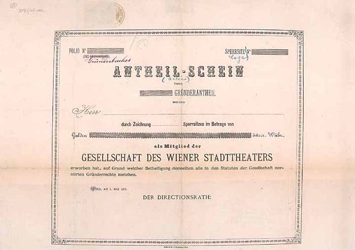| Vorheriges Los | Zurück | Nächstes Los | | Losnr.: | 310 (k.u.k Monarchie / Nachfolgestaaten) | | Titel: | Gesellschaft des Wiener Stadttheaters | | Auflistung: | Antheil-Schein 1.5.1871 (Probedruck der Gründeraktie). | | Ausruf: | 3.000,00 EUR | Ausgabe- datum: | 01.05.1871 | Ausgabe- ort: | Wien | | Abbildung: |  | | Info: | Gegründet 1871 von dem deutsch-österreichischen Journalisten Max Friedländer und dem deutschen Schriftsteller und Dramatiker Heinrich Rudolf Constanz Laube. Die beiden wollten damit ein bürgerliches Theater errichten, das - ohne Zensur - den kaiserlichen Hoftheatern Konkurrenz machen sollte. Das nach den Plänen des berühmten Architekten Ferdinand Fellner gebaute Theater befand sich im 1. Wiener Gemeindebezirk Innere Stadt, gelegen zwischen Himmelpfortgasse, Seilerstätte und Schellinggasse. Eröffnet wurde das Haus am 15.9.1872 mit Schillers Demetrius in einer Bearbeitung Laubes. 12 Jahre nach der Eröffnung brannte das Haus 1884 nieder. Da das Gebäude nicht an allen vier Seiten frei stand, wurde nach den damaligen Brandschutzbestimmungen ein Wiederaufbau des Schauspielhauses nicht zugelassen. 1886 kaufte Anton Ronacher die Brandruine und ließ wiederum von Ferdinand Fellner 1887-1888 darauf ein Concert- und Ballhaus errichten. Das neue Etablissement Ronacher war kein Schauspielhaus, sondern mit Tischen und Stühlen ausgestattet. Während der Vorstellung durfte getrunken, gegessen und geraucht werden. Nach dem 2. WK war das Ronacher bis 1955 Ausweichbühne für das durch Bomben beschädigte Burgtheater. Ab 1960 nutzte das österreichische Fernsehen die Räumlichkeiten für TV-Produktionen. Ab 1986 erfolgte wieder die Aufführung einer Operette. 1987 kauften die Vereinigten Bühnen Wien das Haus und führten das Musical Cats und zwei Opern auf. Nach einigen Jahren als Gastspielhaus für internationale Produktionen und Festveranstaltungen wurde das Ronacher für knapp 50 Mio. Euro zu einer Musicalbühne ausgebaut. Heute gehört das Haus über die Wien Holding GmbH zu 100% der Stadt Wien. | | Besonder-heiten: | Rückseitig mit aufgeklebter und abgestempelten 15 kr.-Briefmarke. Anscheinend wurde der Probedruck an einen der Gründer zur Ansicht per Post eingeschickt. Drei Korrekturen wurden handschriftlich auf dem Probedruck vermerkt, u.a. aus “Antheil-Schein” sollte “Actie” werden. | | Verfügbar: | Kulturhistorisch bedeutende Rarität. | | Erhaltung: | VF | | Zuschlag: | 3.000,00 EUR n |