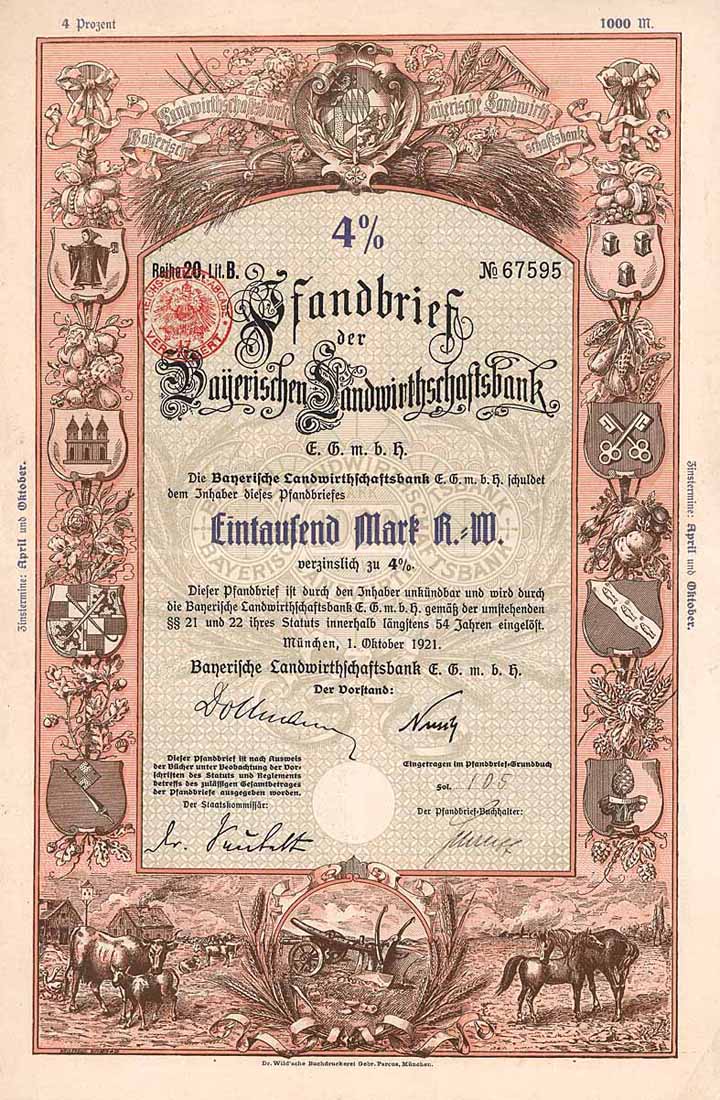 | Vorheriges Los | Zurück | Nächstes Los | | Losnr.: | 717 (Deutschland bis 1945 (Nicht Reichsbank)) | | Titel: | Bayerische Landwirthschaftsbank eGmbH | | Auflistung: | 4 % Pfandbrief Lit. B 1.000 Mark 1.10.1921 (R 10). | | Ausruf: | 140,00 EUR | Ausgabe- datum: | 01.10.1921 | Ausgabe- ort: | München | | Abbildung: |  | | Stücknr.: | 67595 | | Info: | Die genossenschaftliche Hypothekenbank wurde 1896 als gemeinnütziges Unternehmen gegründet. Genossen konnten alle Eigentümer land- und forstwirtschaftlicher Grundstücke werden, ferner ländliche Gemeinden. Der Gesamtumlauf der in München, teils auch Frankfurt börsennotierten Pfandbriefe erreichte bis 1940 rd. 100 Mio. RM. Nach dem Krieg umfirmiert von Bayerische Landwirthschaftsbank eGmbH in Münchener Hypothekenbank e.G.: ein noch heute bedeutendes Realkreditinstitut. | | Besonder-heiten: | Die dekorativsten jemals in Deutschland ausgegebenen Pfandbriefe. | | Verfügbar: | R 10 | | Erhaltung: | Mit Kupons. EF-VF. | | Zuschlag: | 140,00 EUR |