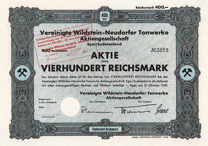 | Vorheriges Los | Zurück | Nächstes Los | | Losnr.: | 1251 (Deutschland bis 1945 (Nicht Reichsbank)) | | Titel: | Vereinigte Wildstein-Neudorfer Tonwerke AG | | Auflistung: | Aktie 400 RM 31.10.1940 (Auflage 3000, R 10). | | Ausruf: | 90,00 EUR | Ausgabe- datum: | 31.10.1940 | Ausgabe- ort: | Eger | | Abbildung: |  | | Stücknr.: | 2859 | | Info: | Die als GmbH gegr. Gesellschaft wurde 1925 in eine AG umgewandelt. 1939 Anpassung der Satzung an das deutsche Aktiengesetz. Es wurden Steingut-, Schamotte-, Kapsel- und Blautöne sowie gebrannte Chamotte hergestellt. | | Verfügbar: | R 10 | | Erhaltung: | Mit Kupons. EF+. | | Zuschlag: | 90,00 EUR |